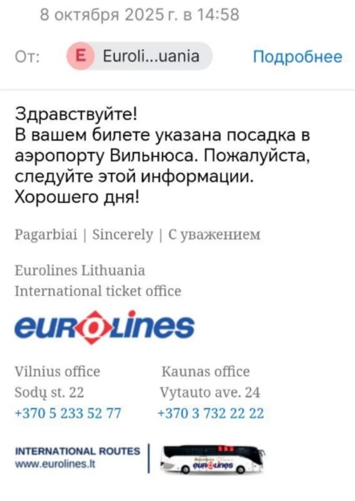 Так ситуация стала еще запутаннее. Ведь на сайте Eurolines указано, что автобус, который отправляется в 9 утра, заезжает в аэропорт и выезжает оттуда в 09.12. Этот рейс выполняется ежедневно.