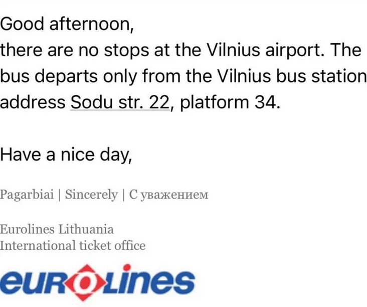 «Снова хочу пожаловаться на поддержку Eurolines. На мой мейл с билетом Вильнюс — Минск на 09.00 14 октября и скриншотом маршрута автобуса, где указано, что в 09.12 автобус останавливается в аэропорту, ответили мне, что остановки в аэропорту нет. Вот что это за вредность такая?! Или они действительно не заходят в аэропорт больше? Кто ездил недавно Вильнюс — Минск на автобусах Eurolines на 09.00 или другое дневное время, отпишитесь, пожалуйста, заходил ли автобус в аэропорт?»