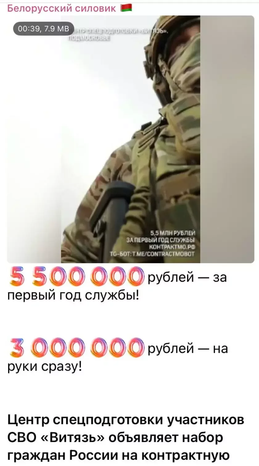 Телеграм-канал «Белорусский силовик», который связывают с лукашенковскими силовыми структурами, активно зазывает белорусов идти воевать за деньги против Украины.