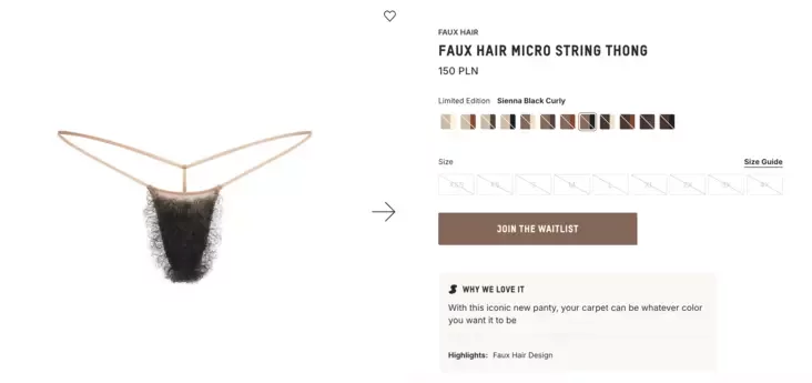 Американская звезда и предпринимательница Ким Кардашьян презентовала новую линейку трусов под собственным брендом Skims. Стринги из этой серии имитируют волосы на лобке. Модель вызвала горячее обсуждение и ажиотаж среди модников — все трусы были раскуплены за пару дней, люди массово записываются в список ожидания, чтобы получить свой размер, когда отшьют новую партию (при том что стоят микростринги 32 доллара за штуку).
