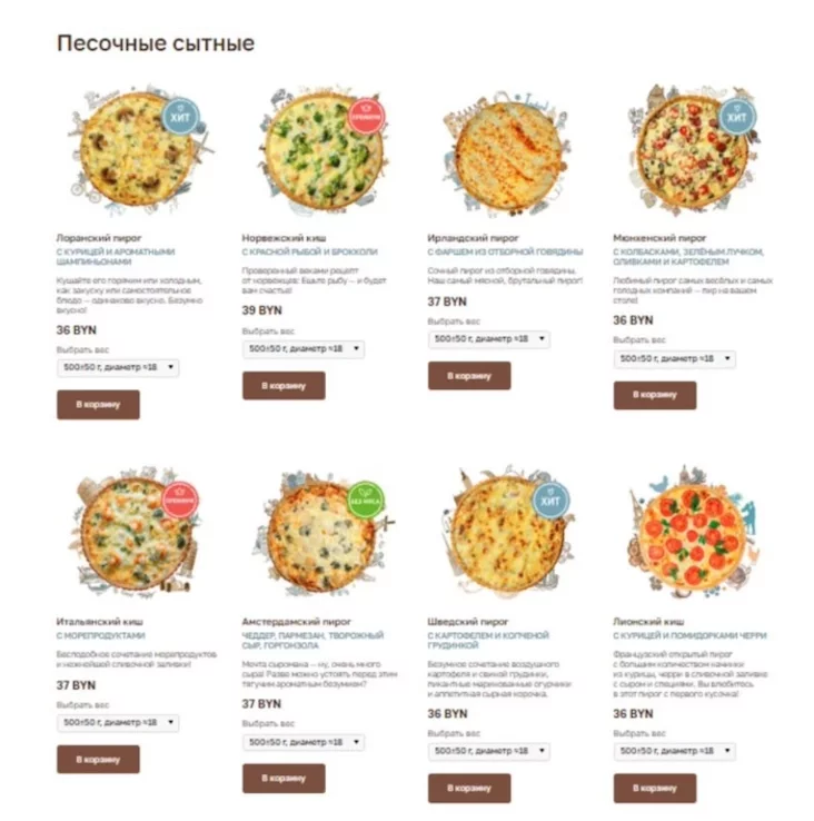 На нашем рынке компания предлагает 17 песочных пирогов с «сытной» начинкой, 15 сладких и три набора тарталеток. В среднем стоимость одного пирога весом 500 г и диаметром 18 см составляет 37 рублей.