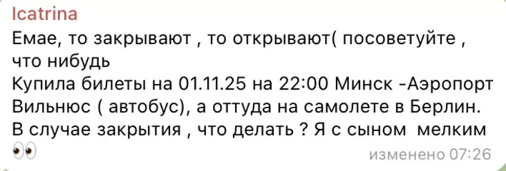 Другая пользовательница советуется в чате, что ей делать, если у нее билеты на 1 ноября на 22:00 из Минска в аэропорт Вильнюса, откуда с маленьким сыном летит на самолете в Берлин.