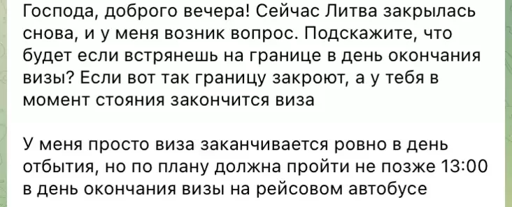 «Подскажите, что будет, если застрянешь на границе в день окончания визы? Если вот так границу закроют, а у тебя в момент стояния закончится виза. У меня просто виза заканчивается ровно в день отбытия, но по плану должна пройти не позднее 13:00 в день окончания визы на рейсовом автобусе».