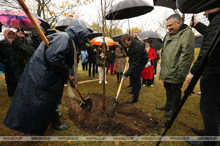 Министр иностранных дел Максим Рыженков вместе с дипломатами под зонтами высаживал липы в Минске — на аллее 80‑летия ООН.