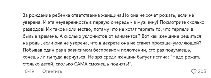 «За рождение ребенка ответственна женщина. Но она не хочет рожать, если не уверена. И эта неуверенность в первую очередь — в мужчину! Посмотрите, сколько разводов! Их такое количество, потому что не хотят терпеть то, что терпели в былые времена. А сколько уклонистов от алиментов? Вот как женщине решиться на роды, если она не уверена, что в декрете она не станет просяще-умоляющей?