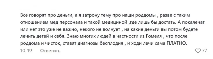 «Все говорят про деньги, а я затрону тему про наши роддомы, разве с таким отношением медперсонала и такой медициной, где лишь бы достать. А покалечат или нет, это уже не важно. Никого не волнует, на какие деньги вы потом будете лечить детей и себя. Знаю много людей, в частности, из Гомеля, что после роддома и чисток ставят диагнозы бесплодия, и ходи лечи сама ПЛАТНО».