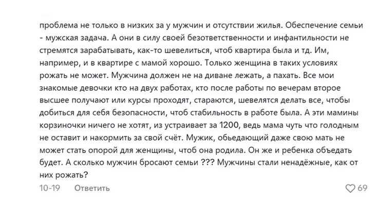 «Проблема не только в низких зарплатах у мужчин и отсутствии жилья. Обеспечение семьи — мужская задача. А они в силу своей безответственности и инфантильности не стремятся зарабатывать, как-то шевелиться, чтобы квартира была и так далее. Им, например, и в квартире с мамой хорошо. Только женщина в таких условиях рожать не может.
