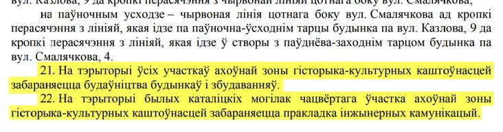 Это не единственный документ, который запрещает строить в этом месте. В 2018 году Министерство культуры утвердило проект зон охраны для многочисленных историко-культурных ценностей, которые размещаются в кварталах на углу проспекта Независимости и улицы Козлова — костела Святой Троицы (Святого Роха), жилой послевоенной застройки, Военных кладбищ и здания Белгосфилармонии.