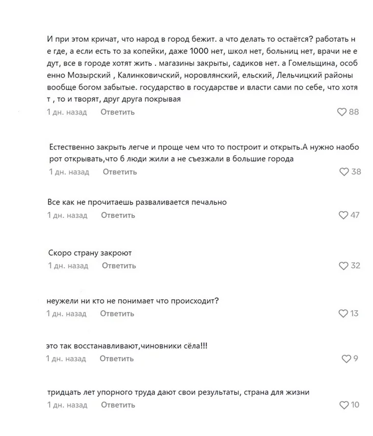 «И при этом кричат, что народ в город бежит. А что делать остается? Работать негде, а если есть, то за копейки, даже тысячи [рублей зарплаты] нет, школ нет, больниц нет, врачи не едут, все в городе хотят жить. Магазины закрыты, садиков нет. А Гомельщина, особенно Мозырский, Калинковичский, Наровлянский, Ельский, Лельчицкий районы, вообще богом забытые. Государство в государстве и власти сами по себе, что хотят, то и творят, друг друга покрывая».