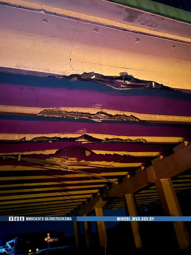 Кстати, 6 ноября милиция как раз сообщала, что под Минском повреждён путепровод. Машина Volvo и полуприцеп при перевозке экскаватора не учли габариты транспорта и повредили 5 балок пролётного соединения.