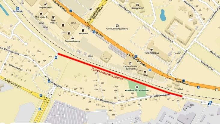 Вместо этого улицу, которая отходит от улицы Колесникова, построят так, что она пройдет перед кладбищем, для чего планируют снести ряд домов, и создаст Т-образный перекресток с улицей Масюковщина. Ее продолжение через гаражный массив обозначено только в перспективе — и может затянуться на десятилетия.