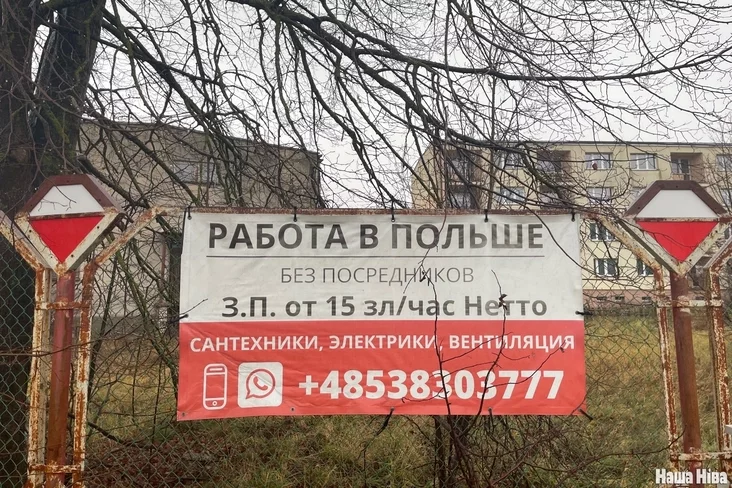 У дороги — два серых облезлых панельных дома, огороженных забором. На заборе висит рекламный банер, который по-русски завлекает работников: сантехников, электриков. Рядом — остановка с выцветшим расписанием движения, а под деревом — самодельный, такой же обшарпанный указатель «Магазин». Направляемся туда.