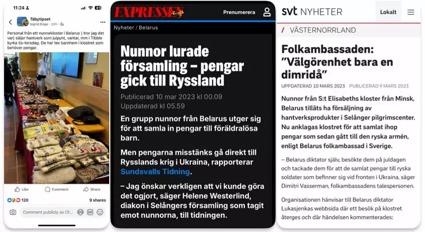 В церкви небольшого шведского города Тебю, который находится недалеко от Стокгольма, заметили торговок от минского Свято-Елисаветинского монастыря, пишет Народное посольство Беларуси в Швеции.