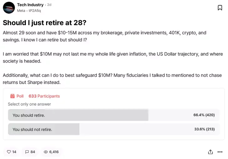 Айтишник из Meta поделился на платформе Blind довольно нетипичной проблемой. К своим почти 29 годам он накопил около $10‑15 миллионов в виде инвестиций, пенсионных отчислений, крипты и других сбережений. Он задумался, почему бы не устроить себе раннюю пенсию, но не может решиться на такой рискованный шаг, так как с учетом инфляции, динамики доллара и направления, в котором катится общество, денег ему до конца жизни может и не хватить, пишет Devby.io.