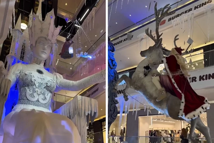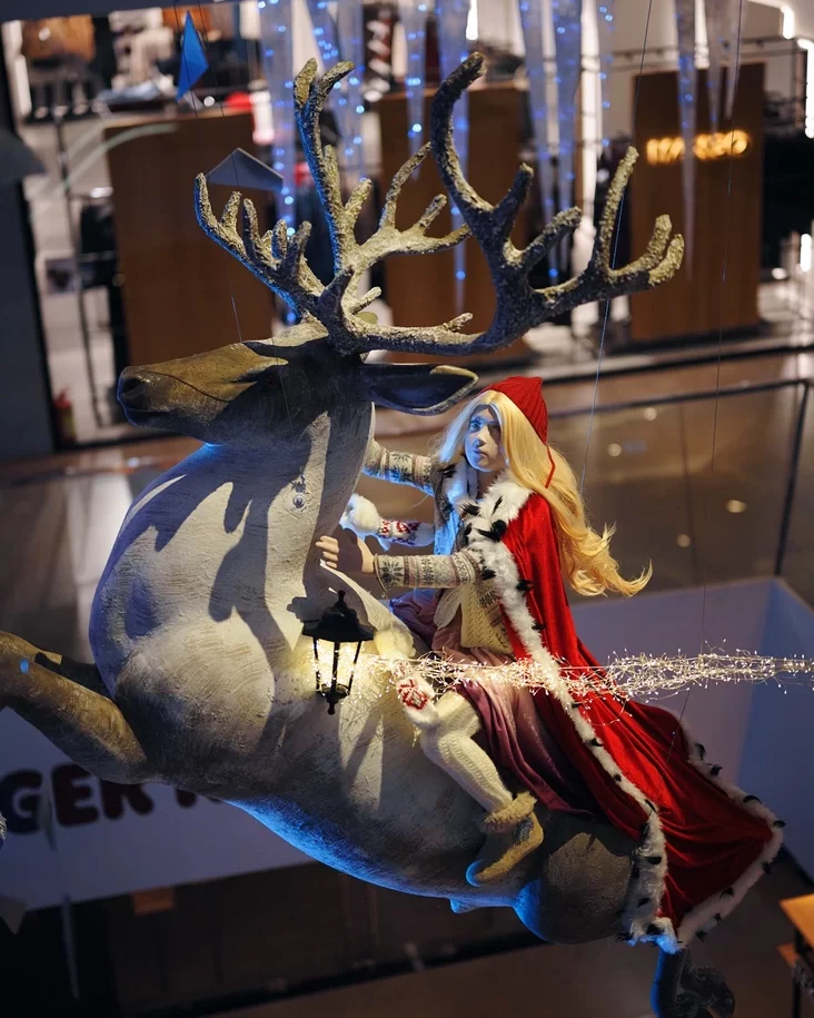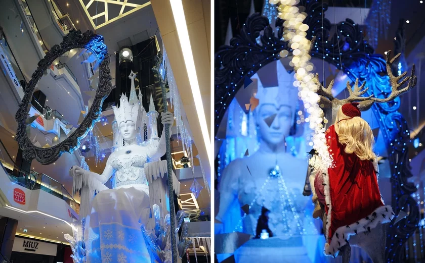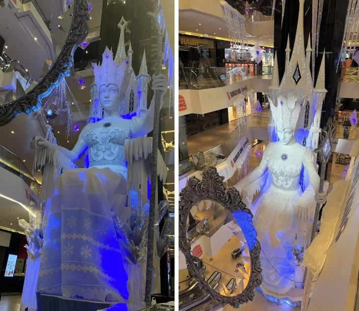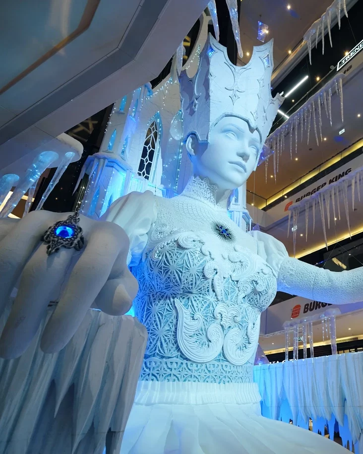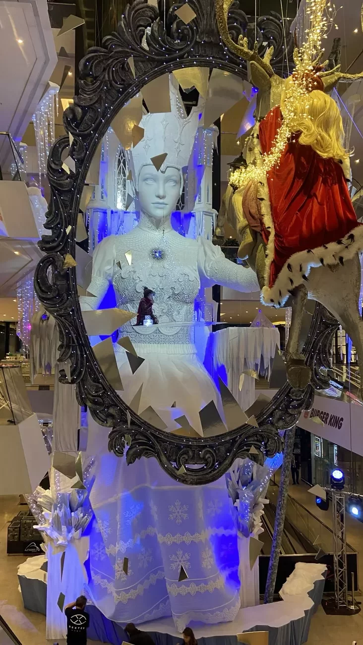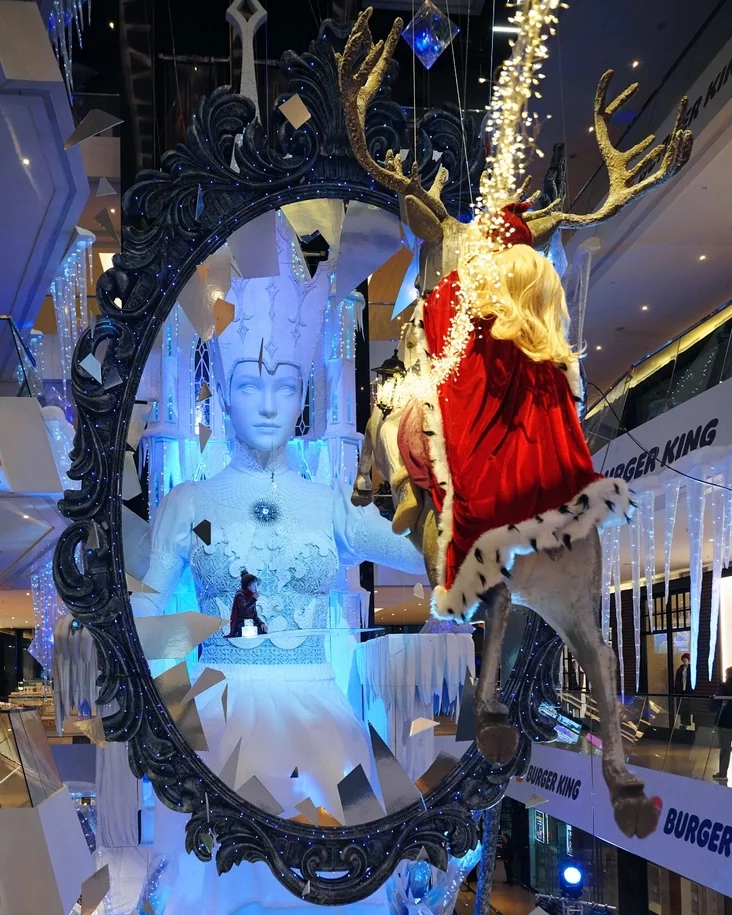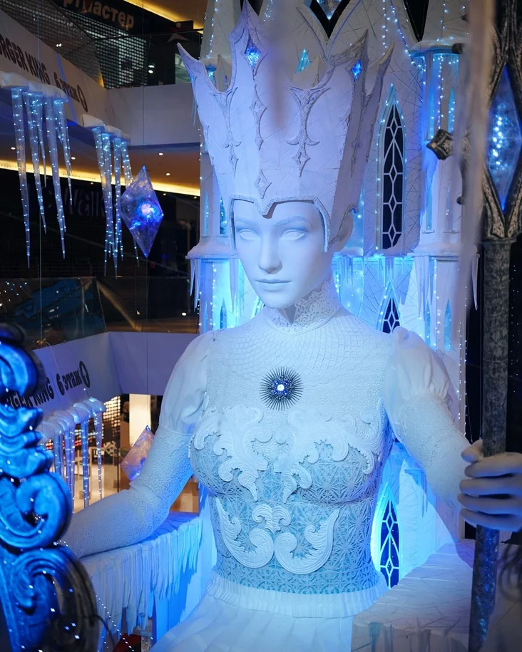 Центральным объектом композиции стала фигура самой повелительницы зимы, сидящей на ледяном троне. Снежная королева возвышается над посетителями, пронизывая пространство торгового центра через несколько этажей.