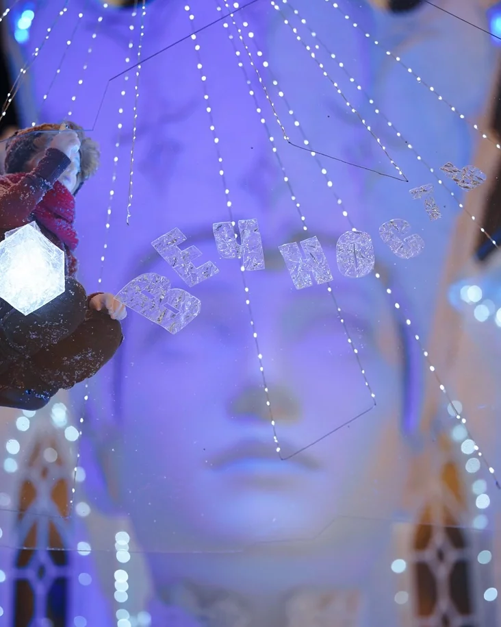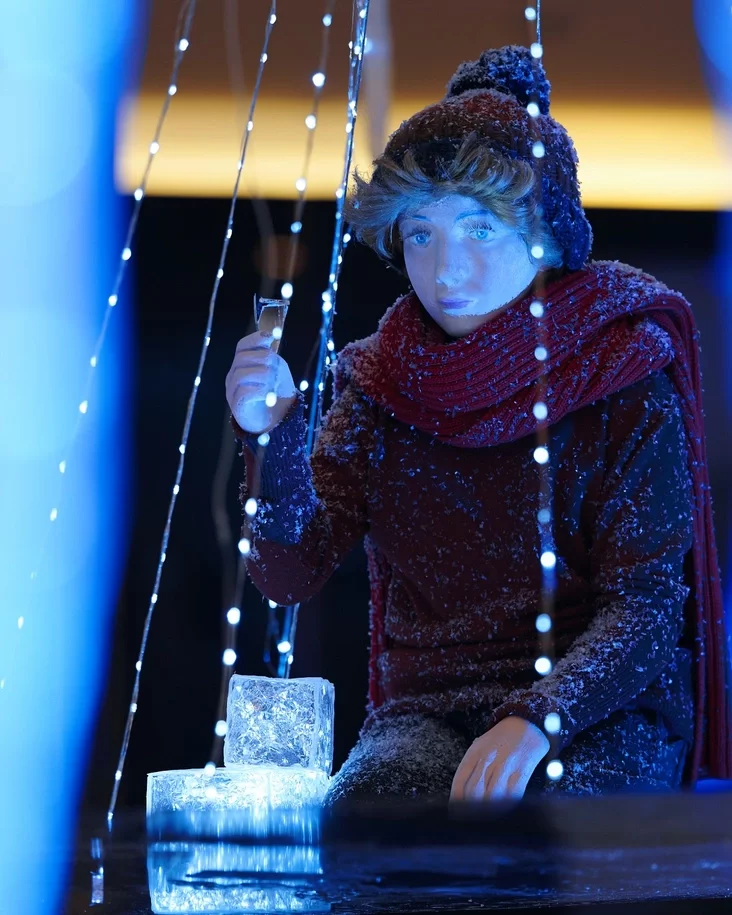 Инсталляция имеет множество деталей, напоминающих о сюжете сказки. Прямо перед лицом гигантской королевы, на тонкой прозрачной льдине, сидит маленький Кай.