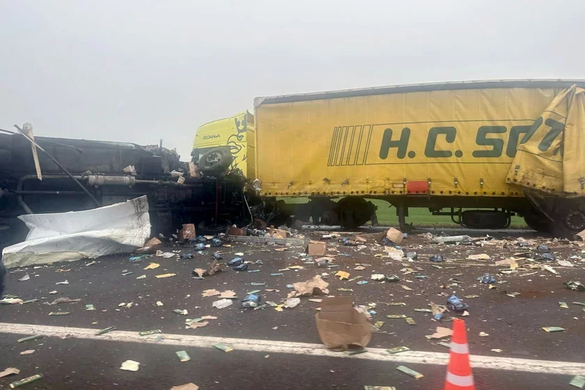 Судя по кадрам с места происшествия, столкнулись грузовик и автопоезд, фура лежит на боку, пишет Onliner.by