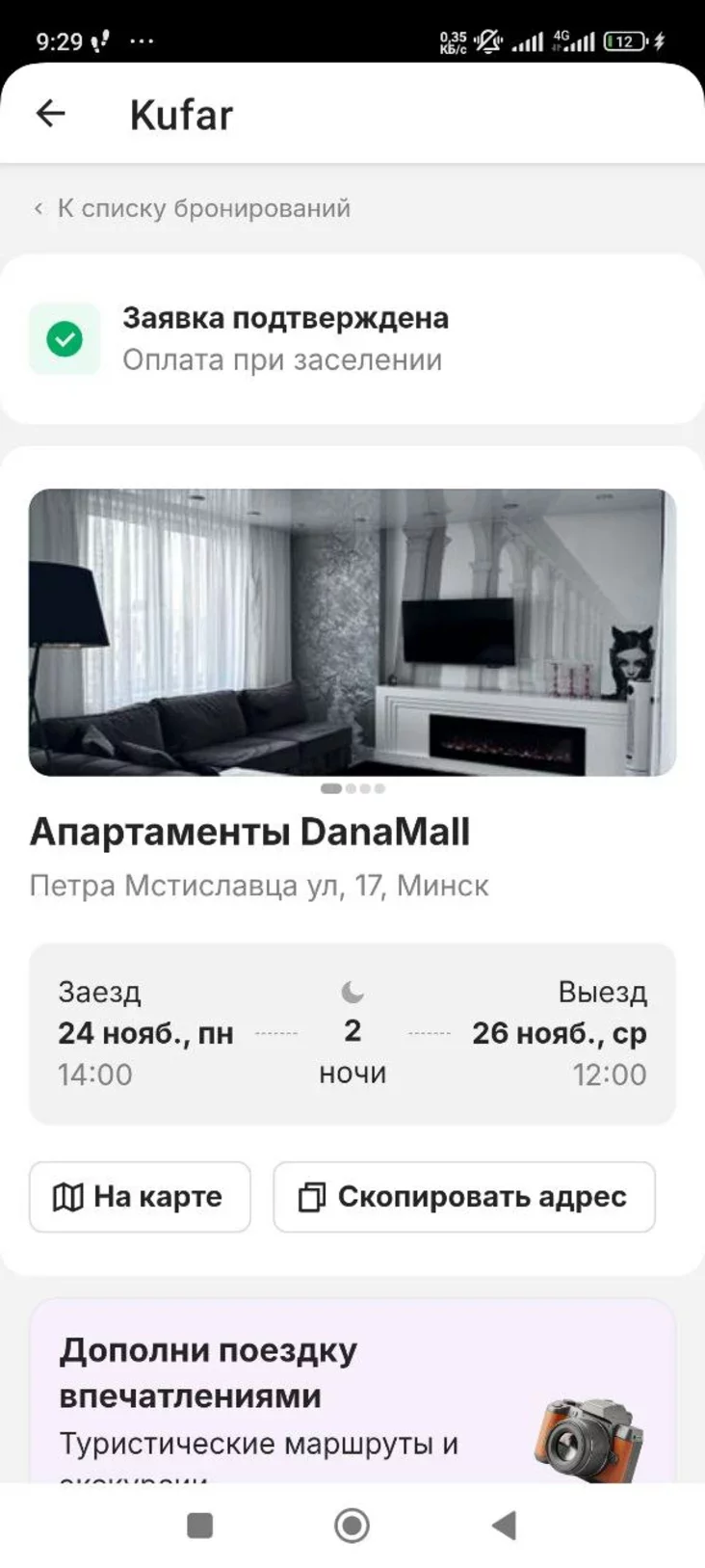 Жилье в Минске по улице Петра Мстиславца, 17 забронировано на две ночи с 24 по 26 ноября. Двухкомнатная квартира общей площадью 63 кв. метра с двумя спальнями находится на 16 этаже. Ее стоимость — 200 белорусских рублей за ночь.