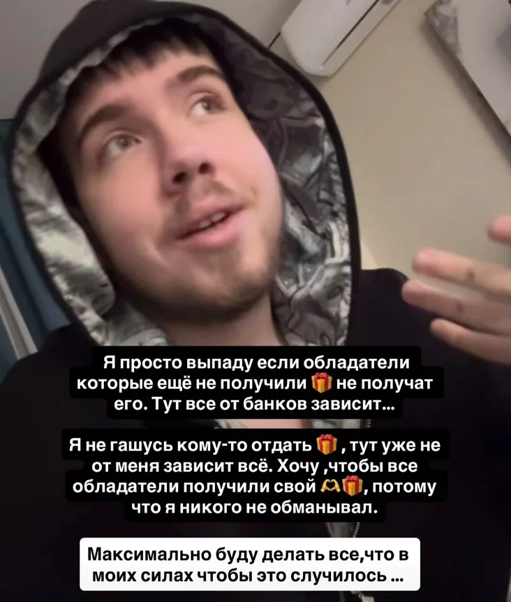 — Айфоши (так блогер называет айфоны — НН) были куплены, но я просто их не успел отправить тем утром. Обидно, что у Евгении было три айфоши, которые даже не мои. Я хочу, чтобы всем все отдали. Забирайте все, что осталось сверх, но верните все победителям.