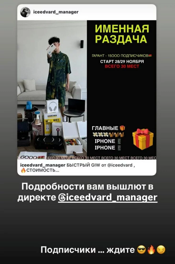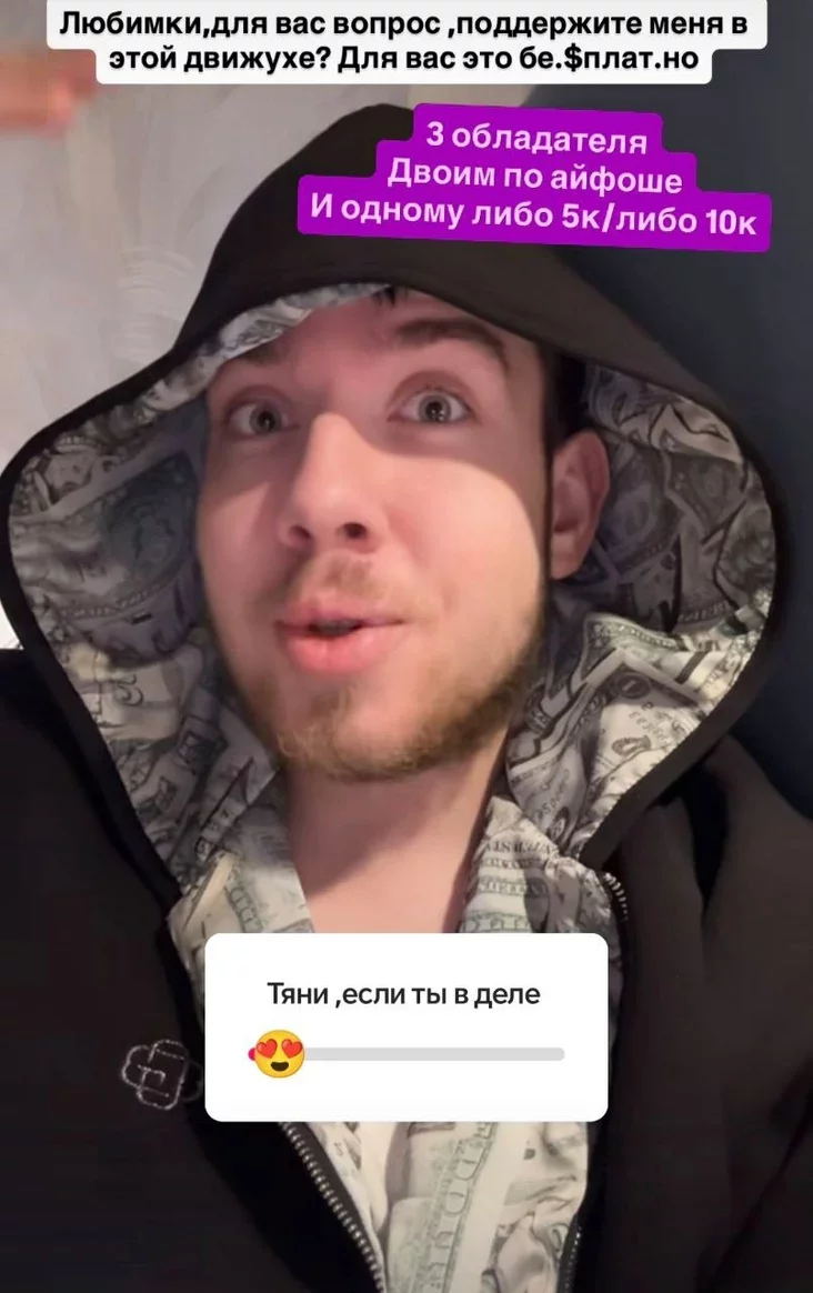 Среди своих подписчиков, кто отреагирует на рекламную сторис, блогер обещает разыграть два айфона и то ли 5 тысяч, то ли 10 тысяч рублей. Говорит, просто чувствует потребность порадовать свою аудиторию.