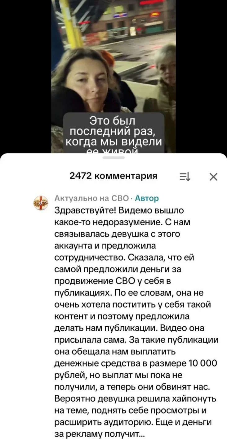 Тем же, кто в комментариях пишет про ложь, администратор отвечает, будто бы Настя сама с ними связалась и просила опубликовать это видео, при этом обещала заплатить 10 тысяч рублей (скорее всего, речь о российских): «Но выплат мы пока не получили, а теперь она обвиняет нас. Вероятно, девушка решила хайпануть на теме, поднять себе просмотры и расширить аудиторию».