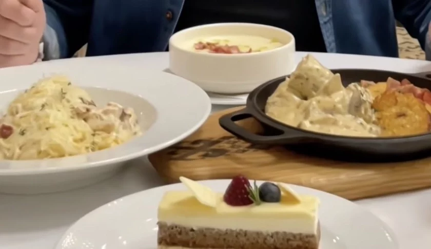 Мужчина заказал крем-суп с сельдереем и беконом, карбонару, мачанку с драниками, колбасками и грибным соусом. Также был десерт и свежевыжатый сок. Цены на позиции такие: суп — Br13, мачанка — Br46, спагетти — Br22, двойной сок — Br7, десерт — Br10.