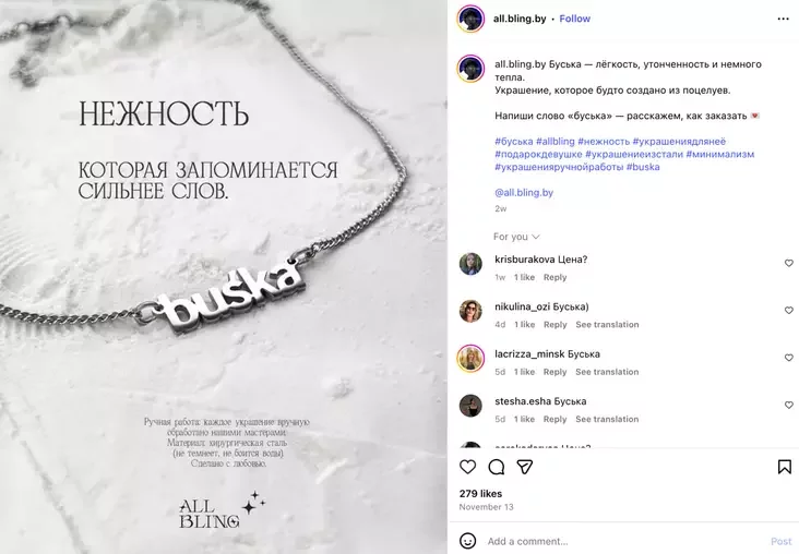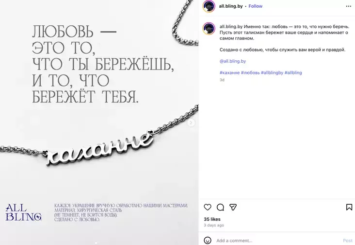 При попытке заказать подвеску «Каханне» в телеграме All bling журналисту «Нашай Нівы» сообщили, что «сейчас это один из самых популярных дизайнов».