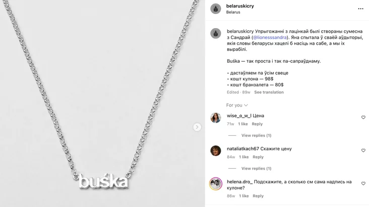 Также на днях в инстаграме All bling появился дизайн «Каханне» и подвеска в виде буквы «Ў» — то, что в свое время активно продавали создатели Belaruskicry по всему миру.
