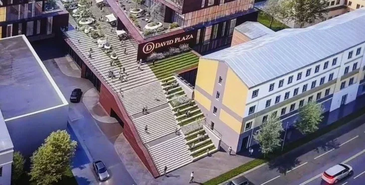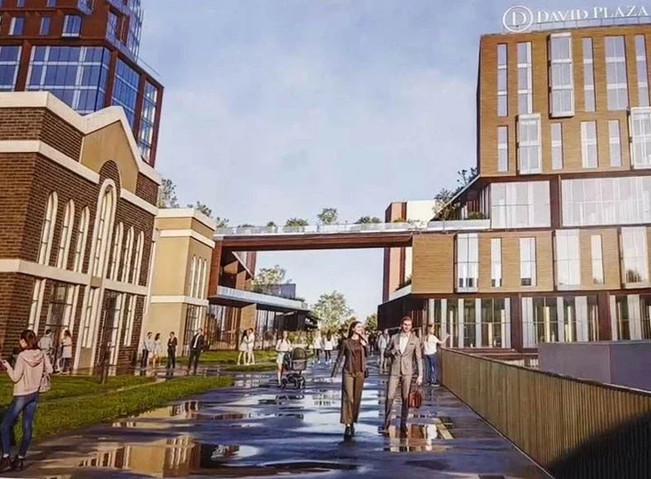 Судя по рендерам, публиковавшихся в СМИ, David Plaza — это масштабный комплекс, состоящий из двух высотных объемов, объединенных общим стилобатом, который займет все внутриквартальное пространство.