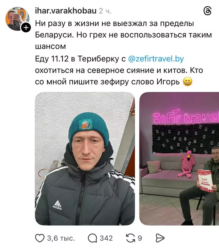 А пока мужчина находится в зените своей внезапной славы, он пользуется ее «бонусами». Недавно он написал в Threads, что 11 декабря от одной из туристических компаний едет в Териберку, что в Мурманской области, — «охотиться на северное сияние и китов».