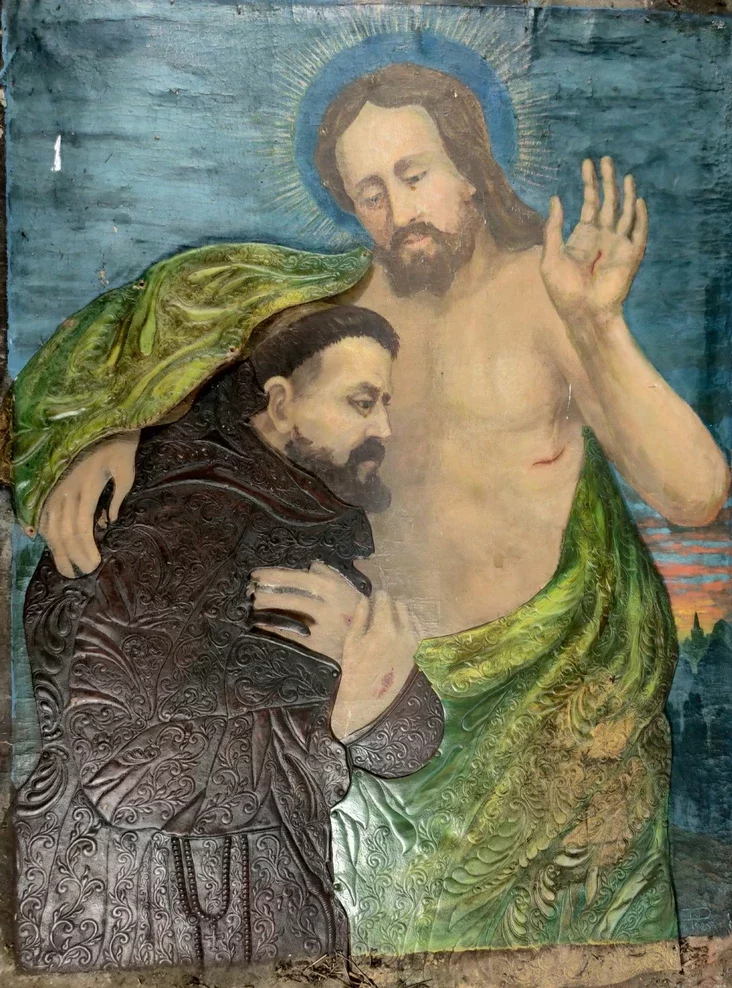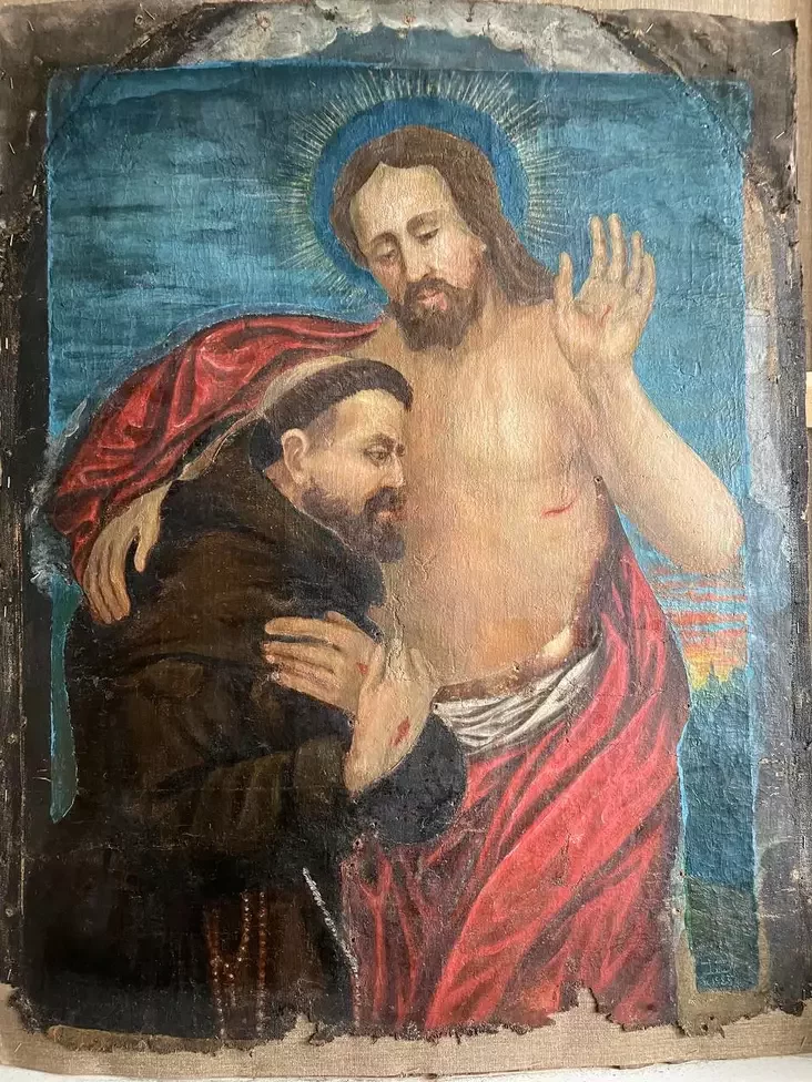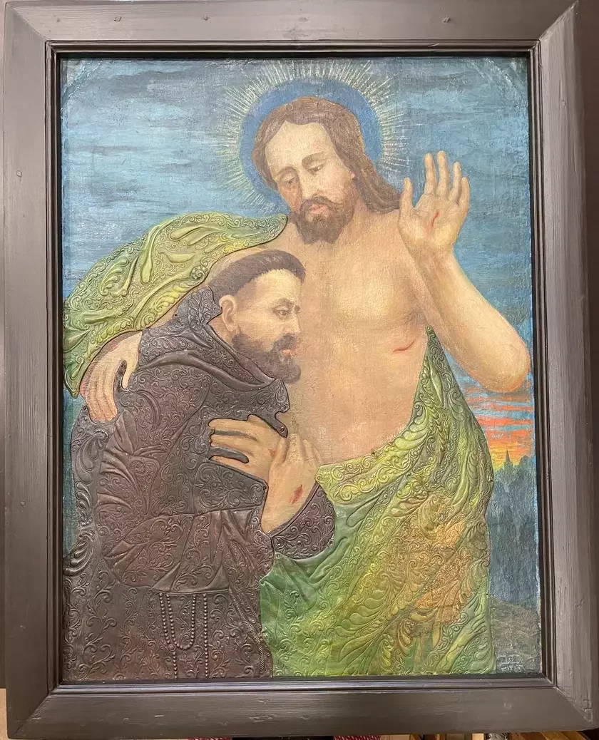 Сюжет иконы также оказался непростым. Это не просто объятия, а редкая иконография «Святой Франциск утоляет жажду из бока Христова». Дмитрий Монич нашел аналог этого сюжета в Италии — алтарное полотно начала XVI века в монастыре капуцинов Монтекасале. Сюжет символизирует возвращение к истокам духовности и потребление «воды живой».