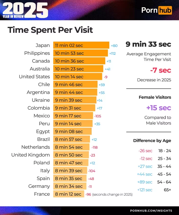 Лидером по продолжительности посещения в этом году стала Япония: среднее время визита составило 11 минут и 2 секунды (в прошлом году Япония была на 8‑м месте с показателем 9:42).