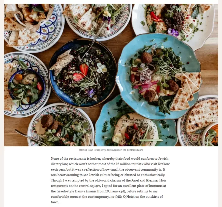На самом деле в статье The Times журналистка, чьи родственники погибли в Аушвице, описывает свое собственное путешествие по следам фильма «Настоящая боль». Она посещает мемориал в Освенциме, а после едет в Краков — в 70 километрах от бывшего лагеря смерти, — где в исторически еврейском квартале Казимеж пробует еврейскую кухню в местных ресторанах. Именно там она остро чувствует искусственность «возрожденной» еврейской культуры без живых носителей, уничтоженных во время Холокоста, и описывает собственные моральные колебания и чувство вины из-за сочетания памяти о геноциде с личным комфортом.