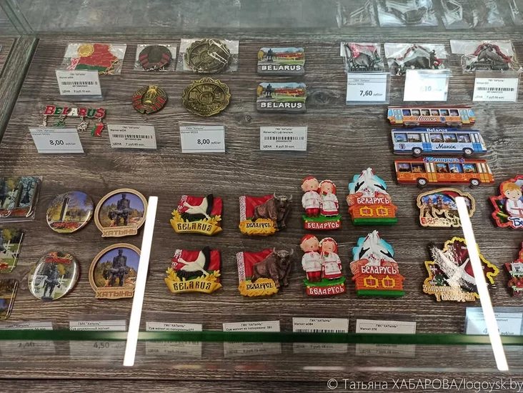 Ассортимент в сувенирном магазине представляет собой замысловатый микс. С одной стороны — книги про войну и значки с изображениями мемориала. С другой — типичный набор белорусских сувениров, которая не соответствует траурному контексту места.