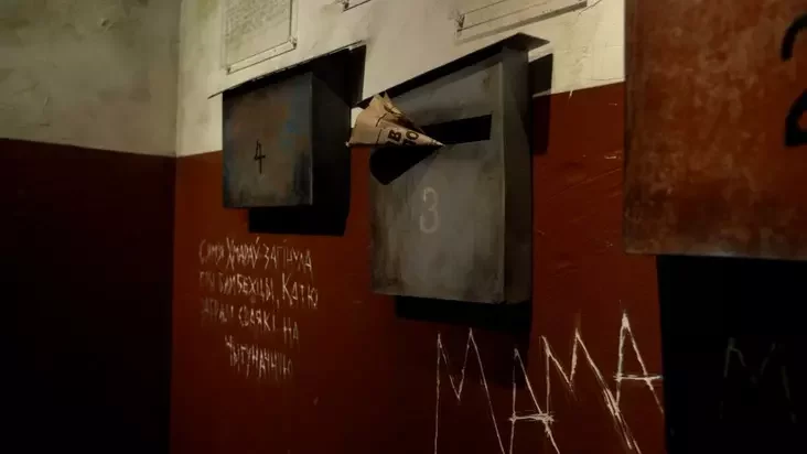 Экспозиция начинается с зала «Бегство от войны». Здесь создан интерьер заброшенной квартиры с разбросанными вещами, где телефонный звонок обрывается звуком взрыва. Один из самых жутких элементов — зеркало, в котором появляется призрачное изображение трехлетней девочки. Голограмма рассказывает историю ребенка, который попал в немецкий детский дом, где из него выкачивали кровь для раненых солдат вермахта.