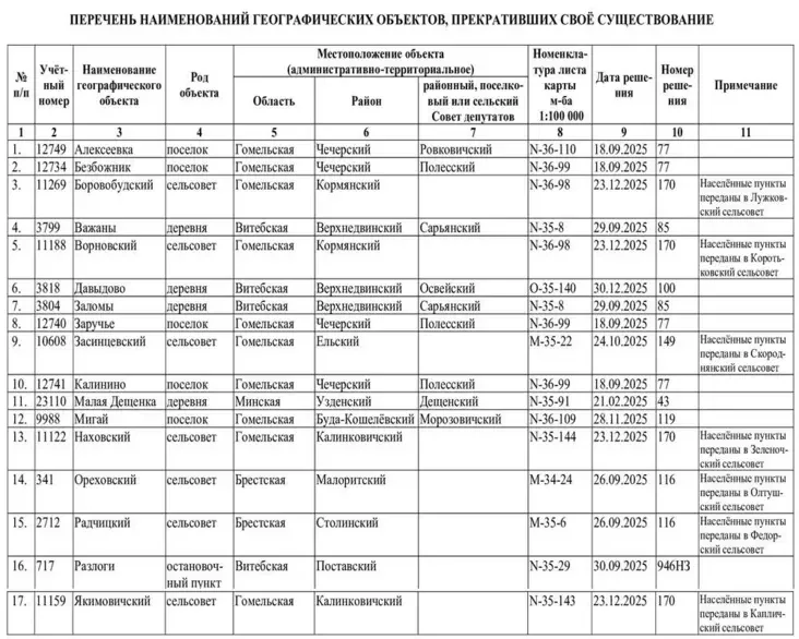 Ежегодно в стране публикуется бюллетень «Изменения названий географических объектов Республики Беларусь». Один из разделов посвящен объектам, прекратившим свое существование, пишет Myfin.