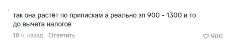 «Так она растет по припискам, а реально зп 900—1300, и то до вычета налогов», — считает еще один комментатор, и его мнение разделяет почти тысяча других людей.