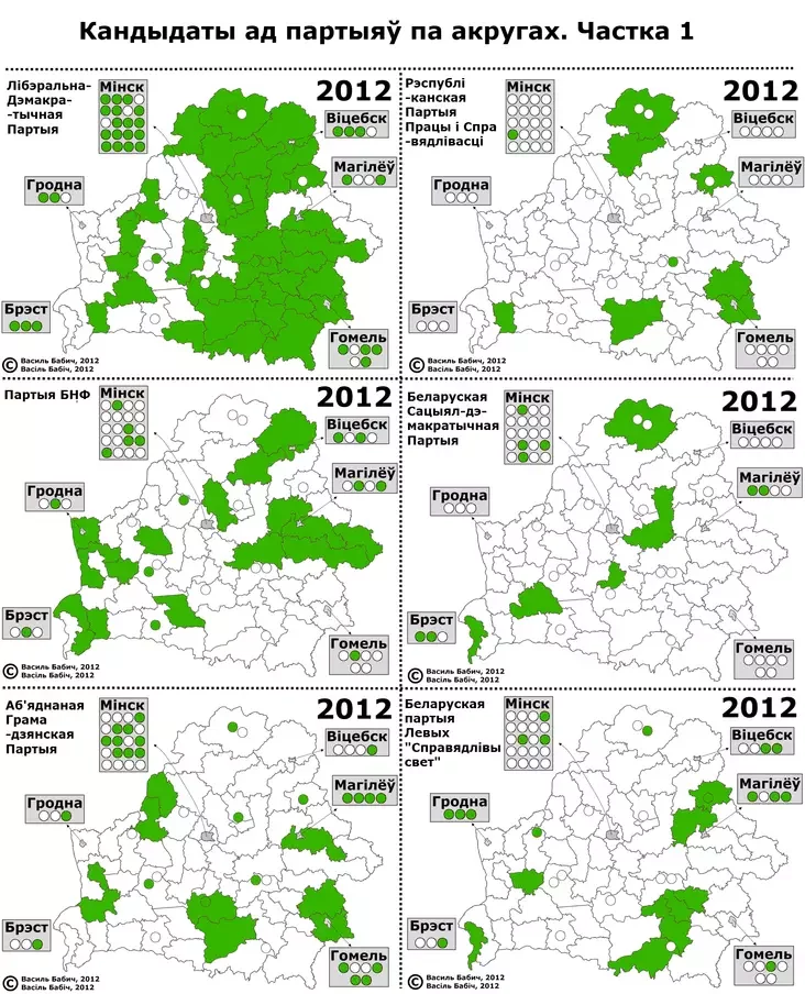 Удивляет Партия БНФ. Когда-то ее идеи были явно более популярны на западе страны, теперь же БНФ в основном выдвинула кандидатов, почему-то, в Могилевской области. Для итогов выборов это, обычно, никакого значения не имеет, но любопытна все же логика руководителей партии.