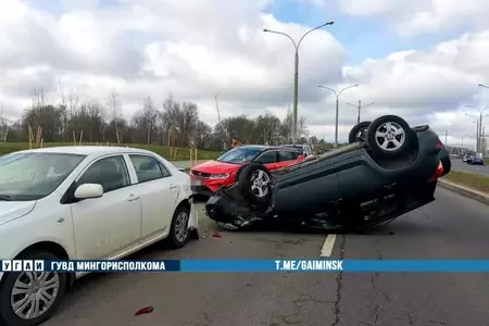 В Лошице автомобиль «Тойота» наехал на бордюр разделительной полосы и опрокинулся