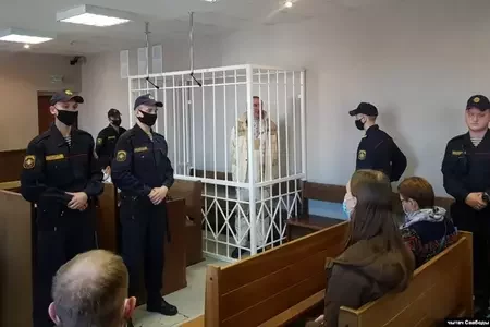 Суд над Алесем Пушкиным: художник в знак протеста лег в белой робе на тюремную скамейку
