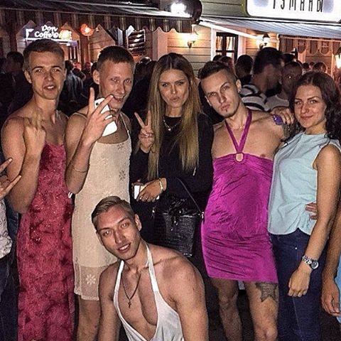 Николай не только сам участвует в подобных провокациях, но и подтягивает друзей, которые тоже умеют веселиться и легкие на подъем. Завсегдатаи заведений на Зыбицкой могли заметить яркую компанию красавцев-парней в платьях — это были они.
