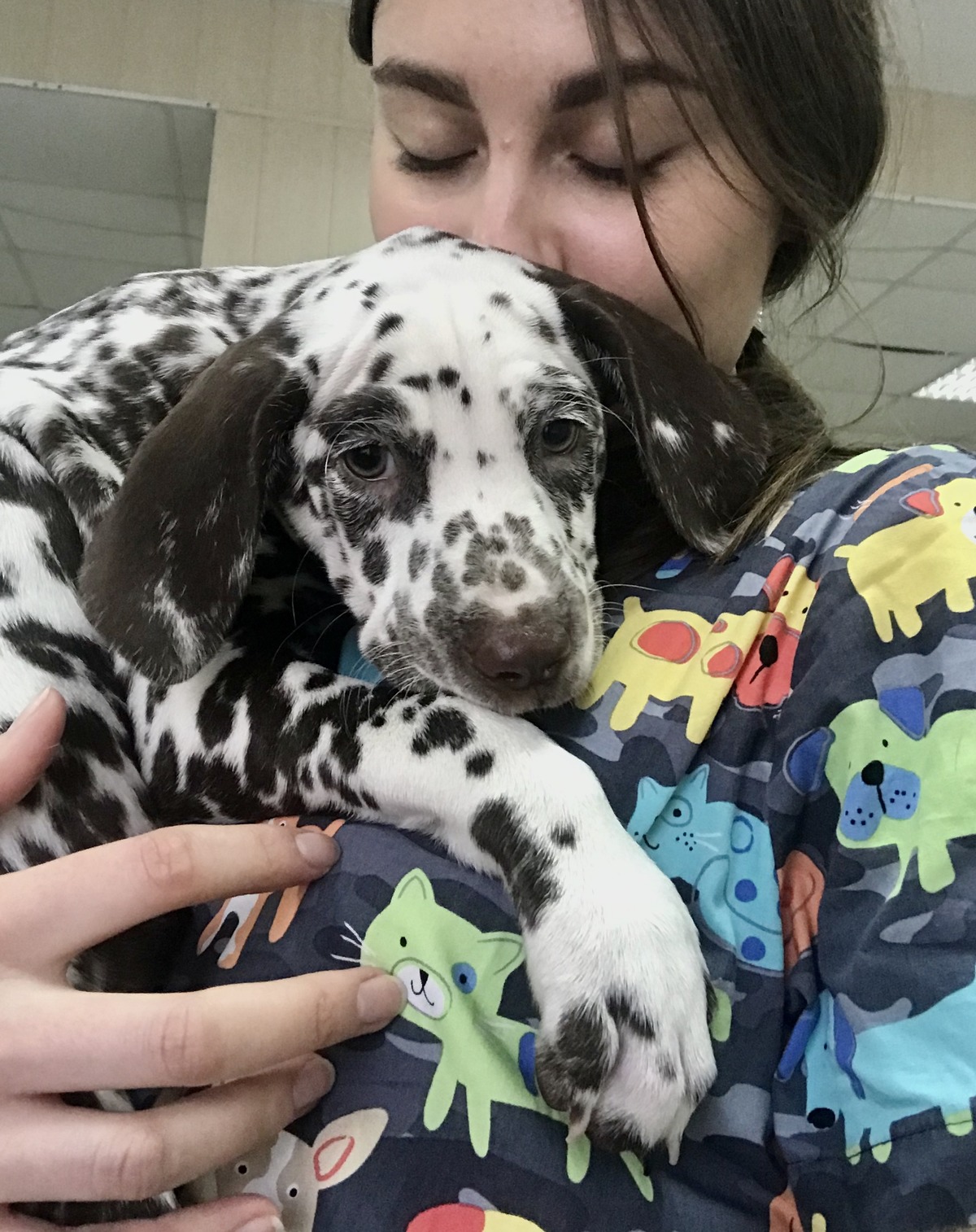 «Гаспадары прывезлі далмацінцаў на першую ў жыцці вакцынацыю. Для нас быццам сеанс каністэрапіі правялі, станоўчыя эмоцыі на ўвесь дзень», — расказала дзяўчына гісторыю фотаздымкаў.